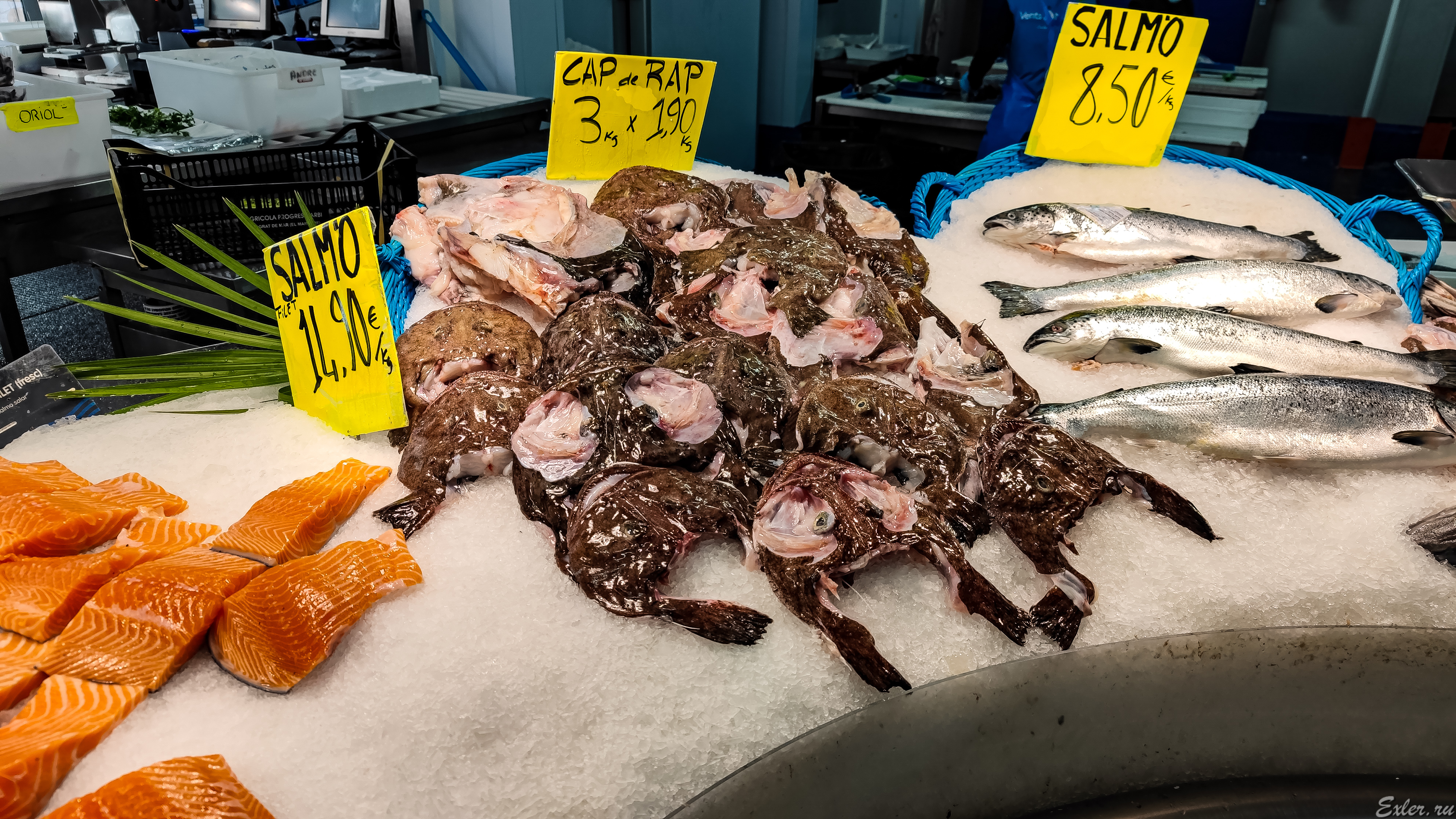 Норвежский лосось (он сюда приезжает свежий, охлажденный - видать на самолетах доставляют) и головы морского черта (Rape) по две копейки. Не знаю, зачем их покупают - видимо, для рыбного бульона. Но здесь продается в различных видах готовый рыбный бульон - натуральный и качественный, так что самим можно и не возиться.