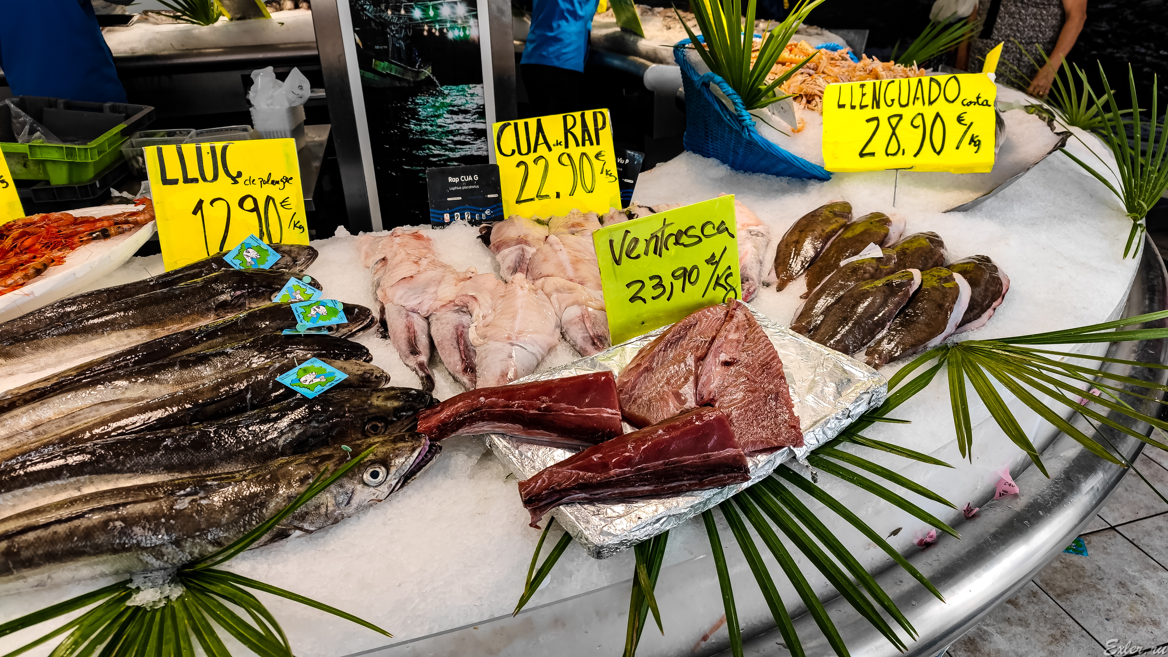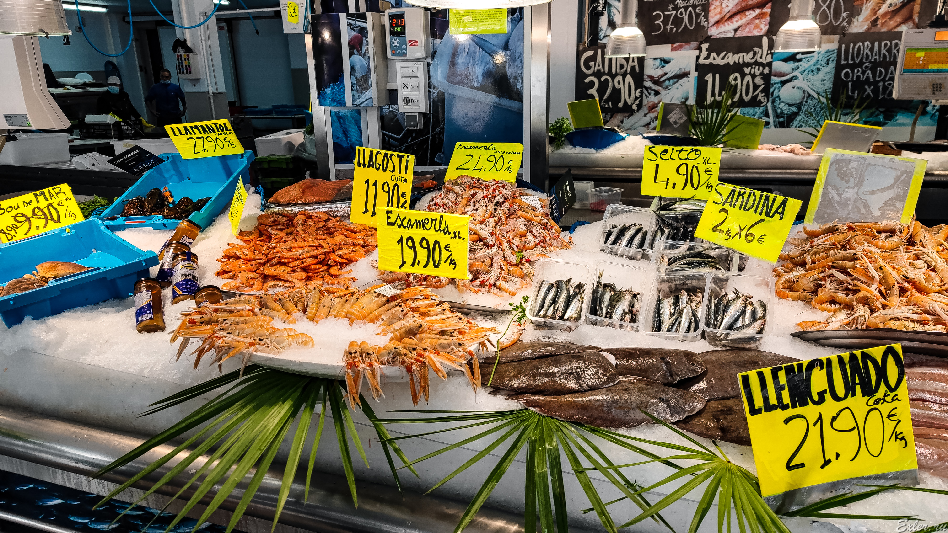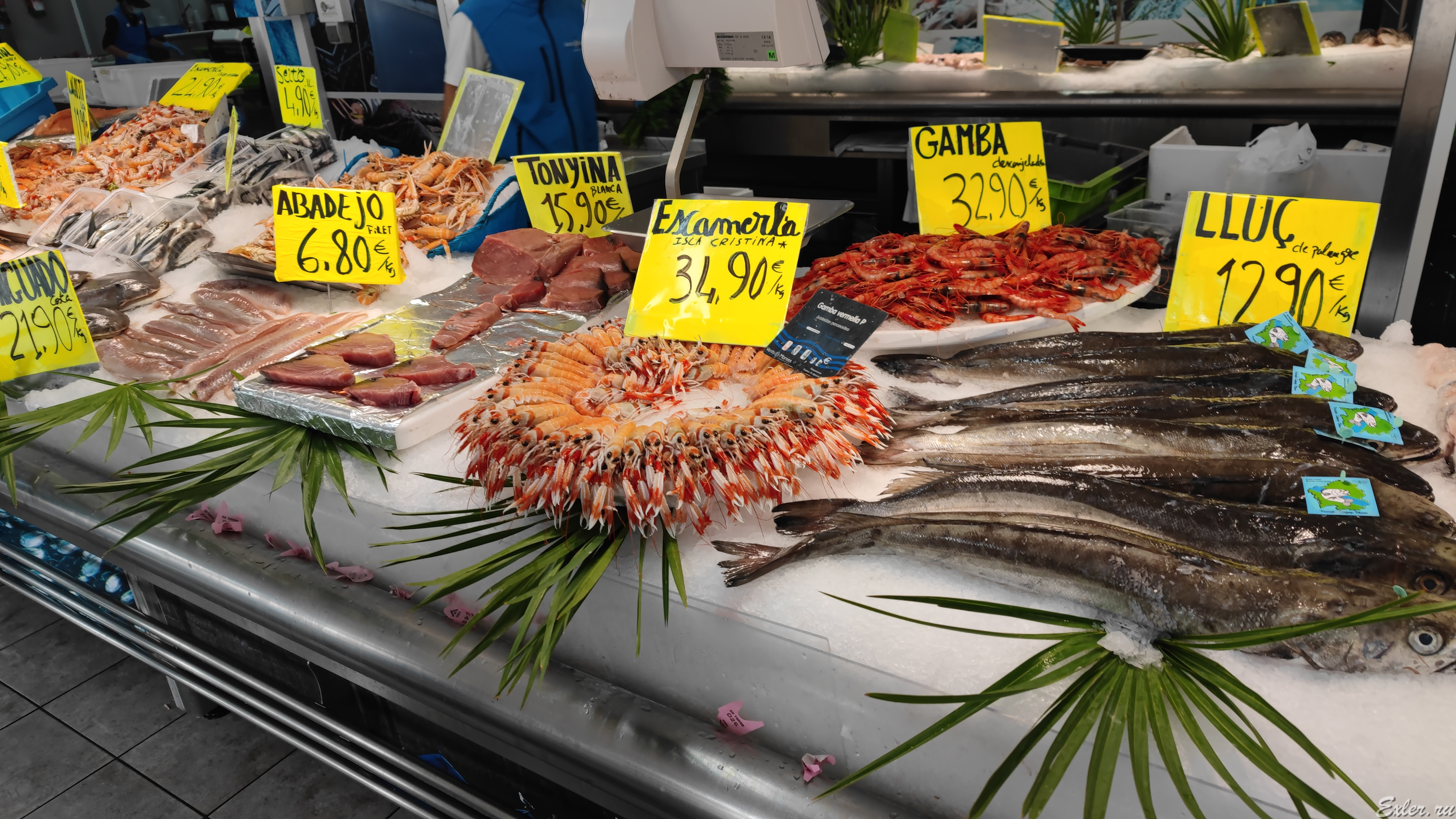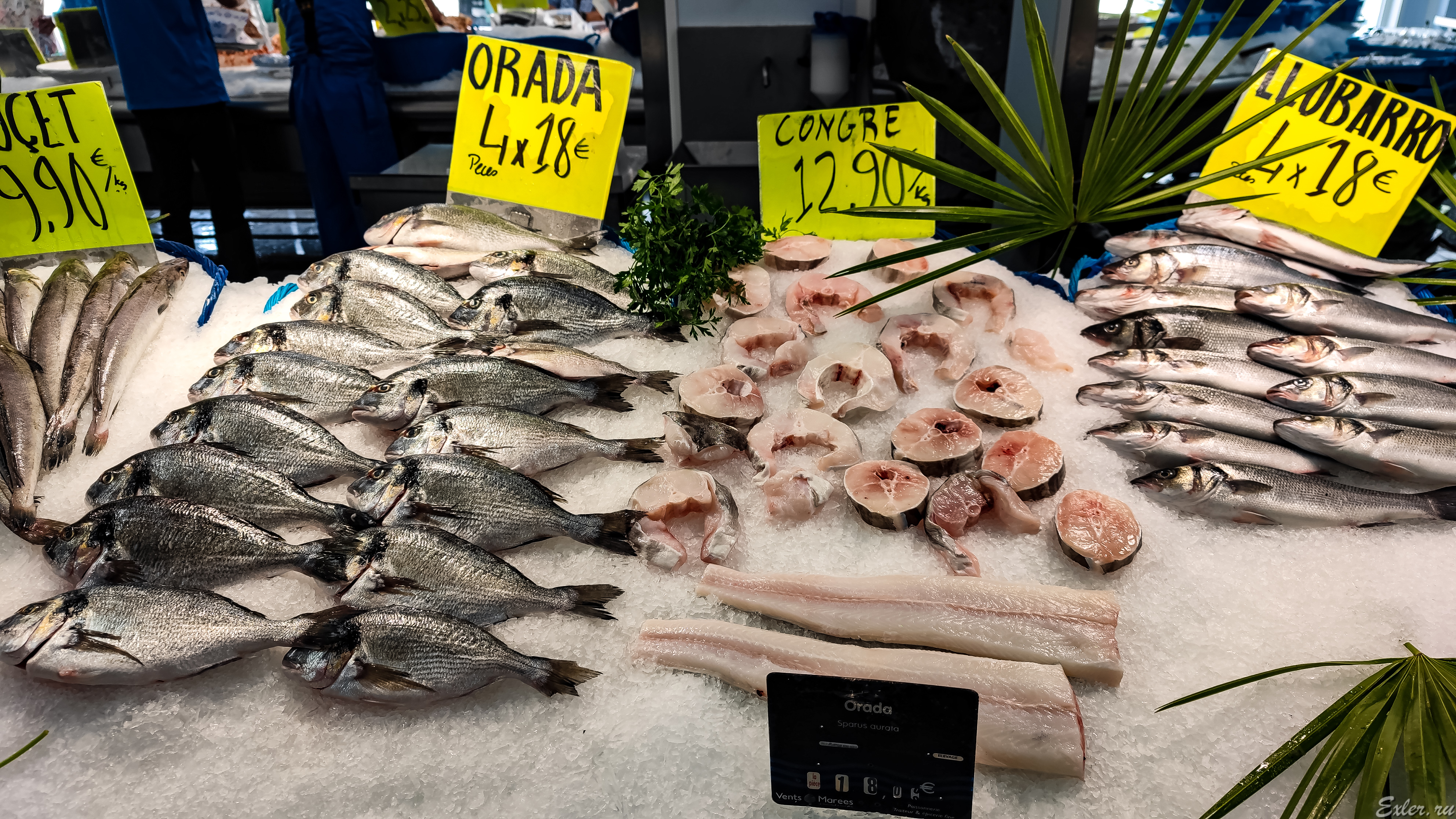 Слева - полуфабрикаты: черный рис для паэльи, паэлья, паэлья из лапши (fideua). В центре - главный местный деликатес Rape (морской черт). Llucet (merluza - разновидность хека).