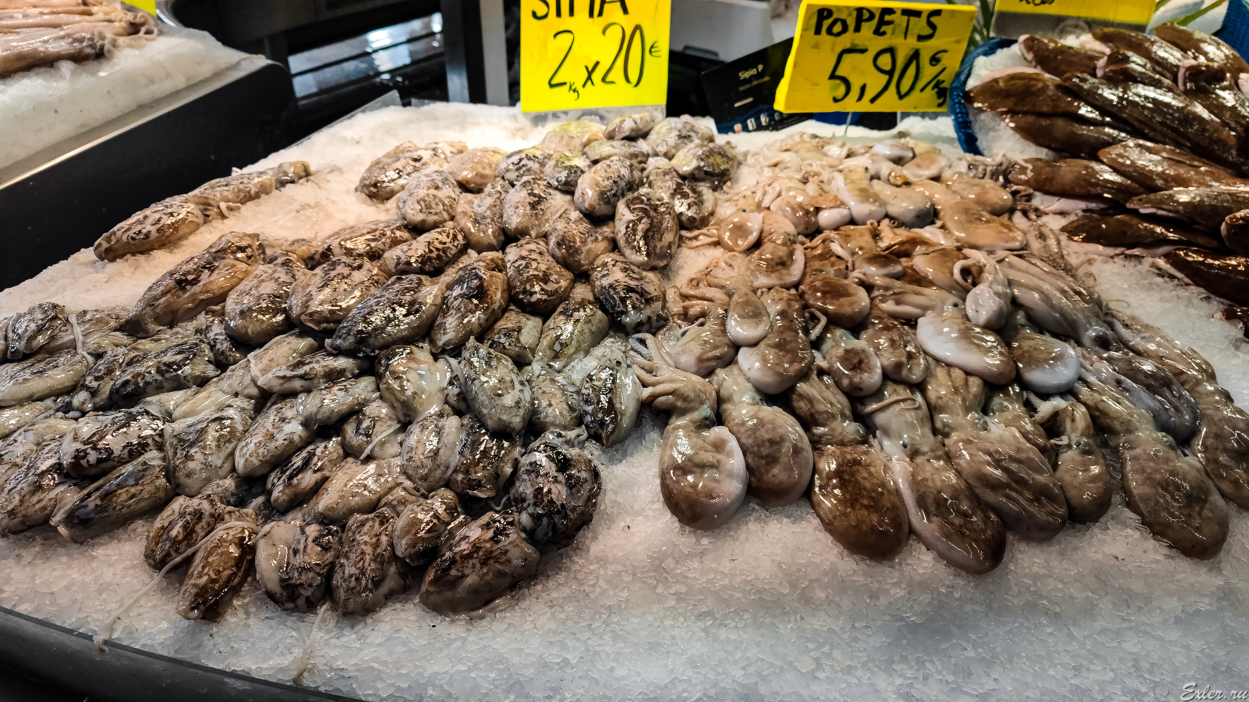 Слева - всякие моллюски и мидии, в центре самые деликатесы - крабы и лангусты. Мы с друзьями договорились на следующей неделе лангустов купить и в котле приготовить.