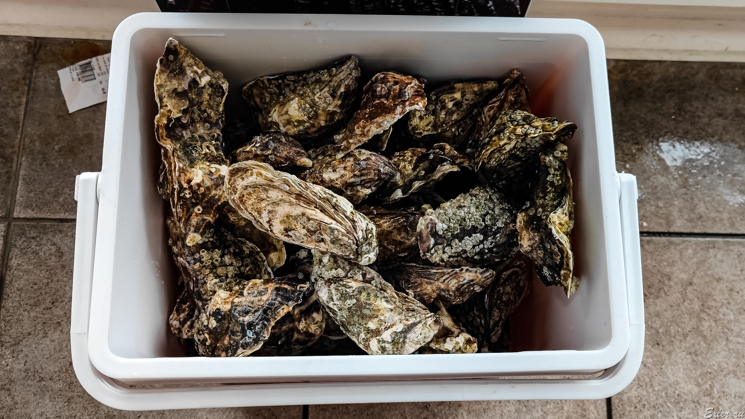 В этот раз устрицы были не бретонские, здоровенные. Взяли пять дюжин - еле-еле все влезло в здоровенную сумку-холодильник. И дорогущие: мы за пять дюжин заплатили 100 евро, то есть дюжина - 20 евро, почти по 2 евро за штуку. Практически как в ресторане. На фермах под Перпиньяном большие устрицы где-то по евро за штуку, а то и дешевле. Но мотаться на фермы - это половину дня нужно потратить, ну его.