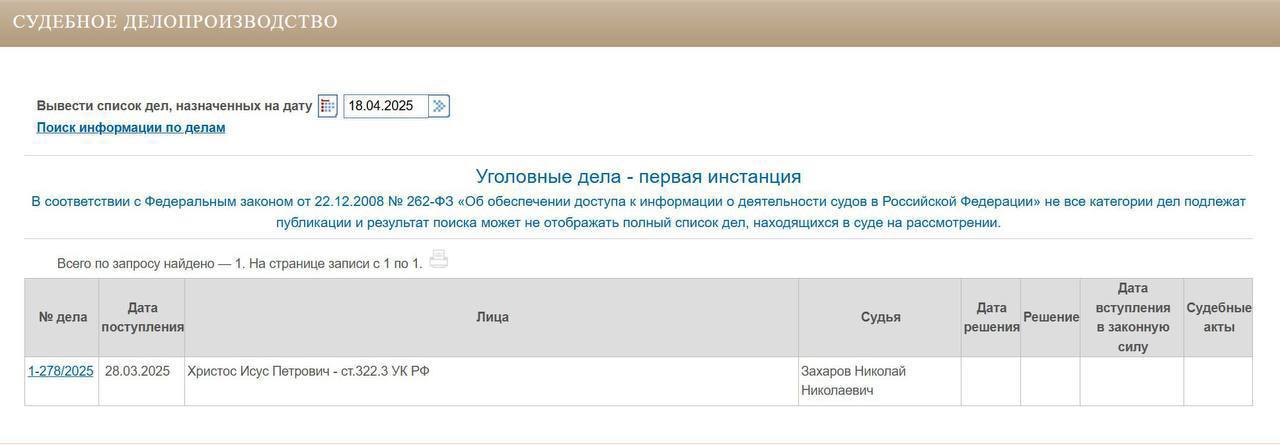 В Казани сорвался суд над Исусом Петровичем Христосом. 45-летнего россиянина обвиняли по статье 322.3 УК РФ (фиктивная регистрация 45 мигрантов в своей квартире), но заседание не состоялось — подсудимый не пришёл в суд. (Отсюда.)