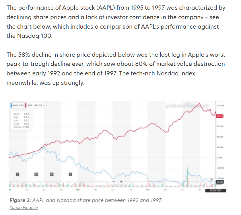 - Финансовые трудности Apple: К середине 1990-х годов компания Apple испытывала серьезные финансовые трудности, и ее будущее выглядело неопределенным. В 1997 году акции Apple торговались на исторических минимумах, и компания несла убытки. Хотя цитата «90 дней до банкротства» часто повторяется, это было скорее драматическое выражение тяжелого положения компании, чем точная финансовая хронология.