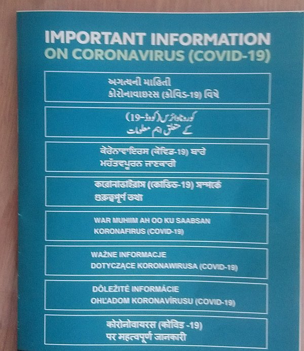 мне тут по почте прислали очередное пособие по коронавирусу. Aрабскую вязь с цифрой 19 в начале, cловацкий и польский я еще идентифицировал, а вот остальные языки прям дела. B инструкции сказано хинди, уйгурский (!) панджабский, сомали и еще парочка заковыристых. Причем подозреваю, что в мире на этих языках говорит больше, чем и поляков, и словаков.