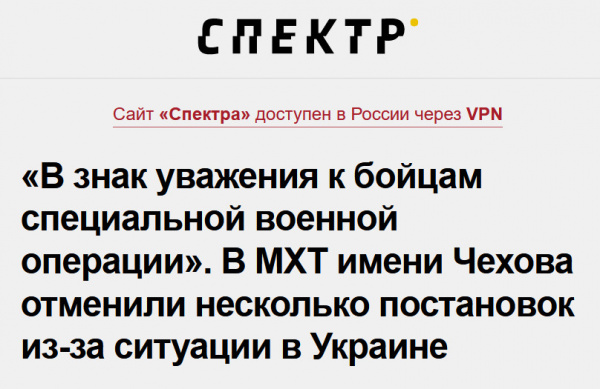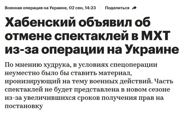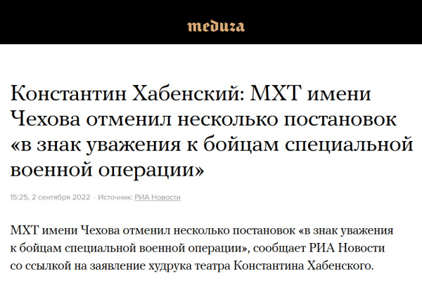 "РИА Новости" опубликовали заметку с заголовком "МХТ имени Чехова отказался от некоторых постановок из-за спецоперации".