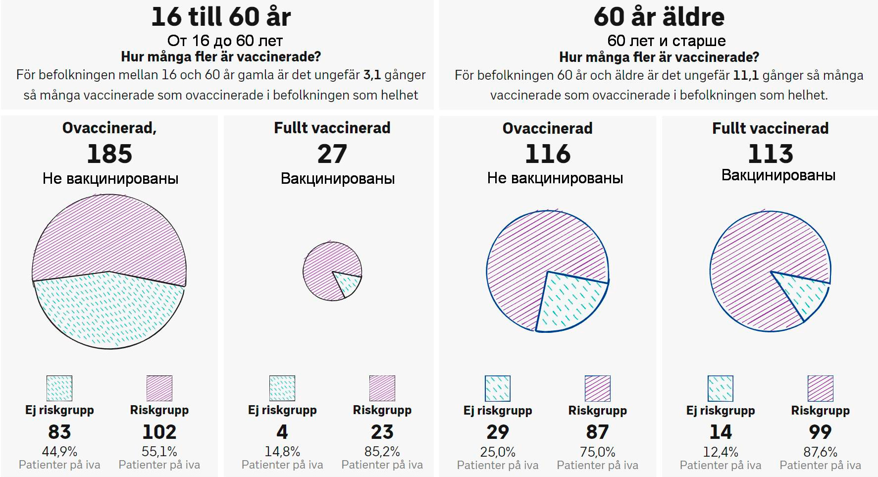 Всего в интенсиве побывали за это время 441 человек в возрасте от 16 и старше. Полностью вакцинированными считаются те, кто получил 2 дозы вакцины (J&J в Швеции не использовали), остальные считаются не вакцинированными.
