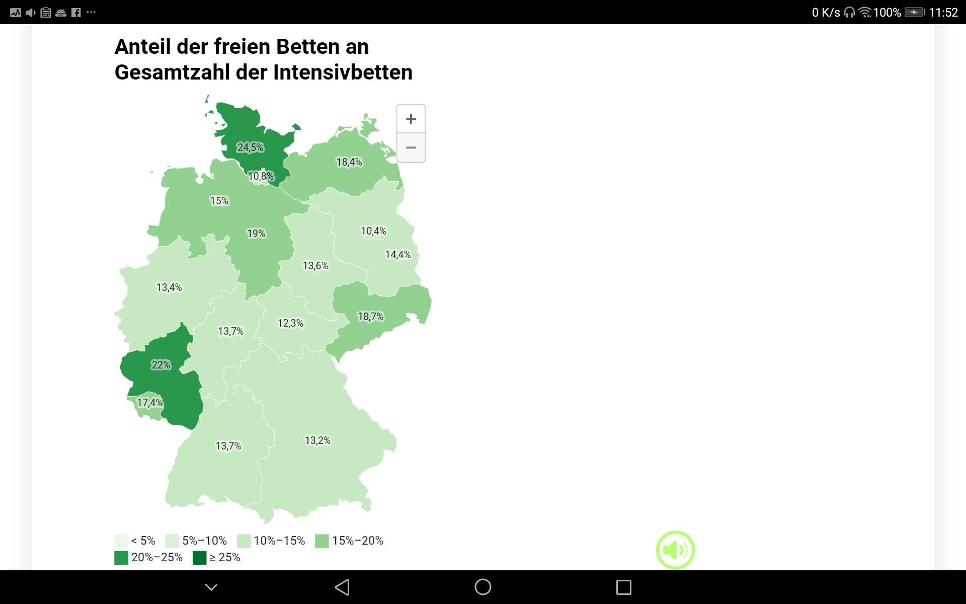 Приведу ещё картинку по числу свободных мест в отделениях интенсивной терапии по Германии. В большинстве регионов их осталось 10-15%, а ещё недавно было 30%. Если взять ещё более подробно по территориальным округам, то кое-где этих коек уже нет. Наличие свободных мест - главный критерий по принятию решения об ужесточении/ослаблении карантинных мероприятий.