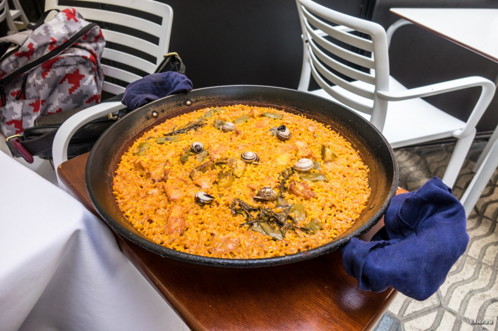 Знаменитая валенсийская паэлья. Морепродукты и обязательно кролик. От обычной паэльи с морепродуктами практически ничем не отличается. Ну, разве что наличием кролика, которые вовсе не задает тон всему пищевому ансамблю.