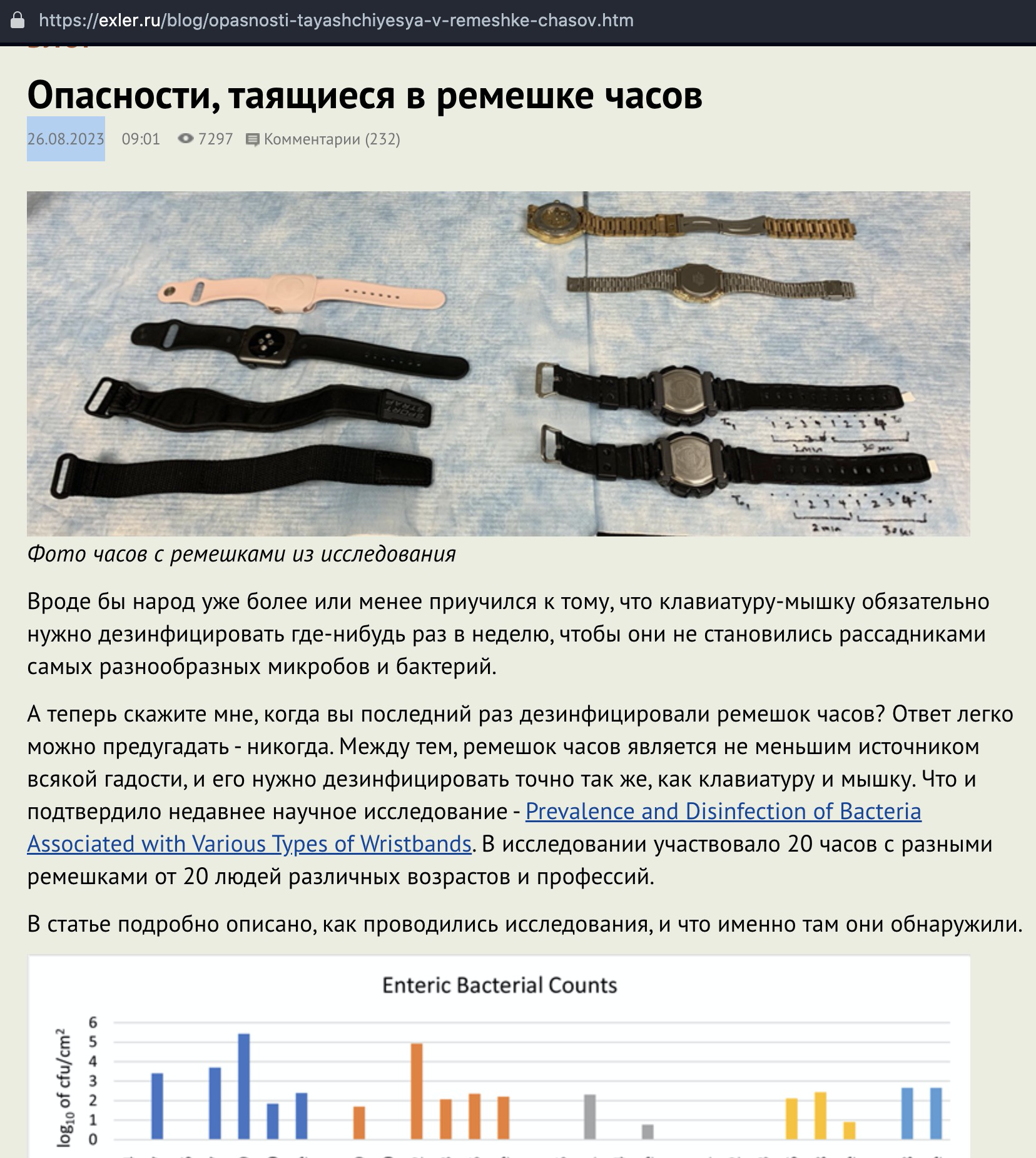 В блоге я неоднократно писал о том, что клавиатуру и мышку в обязательном порядке необходимо дезинфицировать - хотя бы раз в пару недель. Так вот, оказывается - хотя это должно быть очевидно, но до меня не доходило, - что ремешки часов являются такими же разносчиками бактерий и вирусов, если их вовремя не дезинфицировать. Причем это доказано научными исследованиями, проведенными учеными из Атлантического университета Флориды.