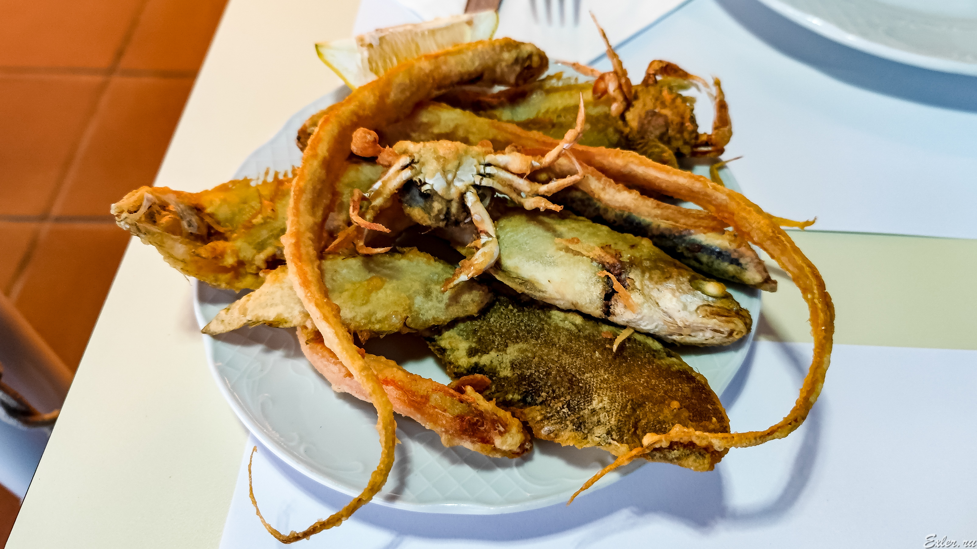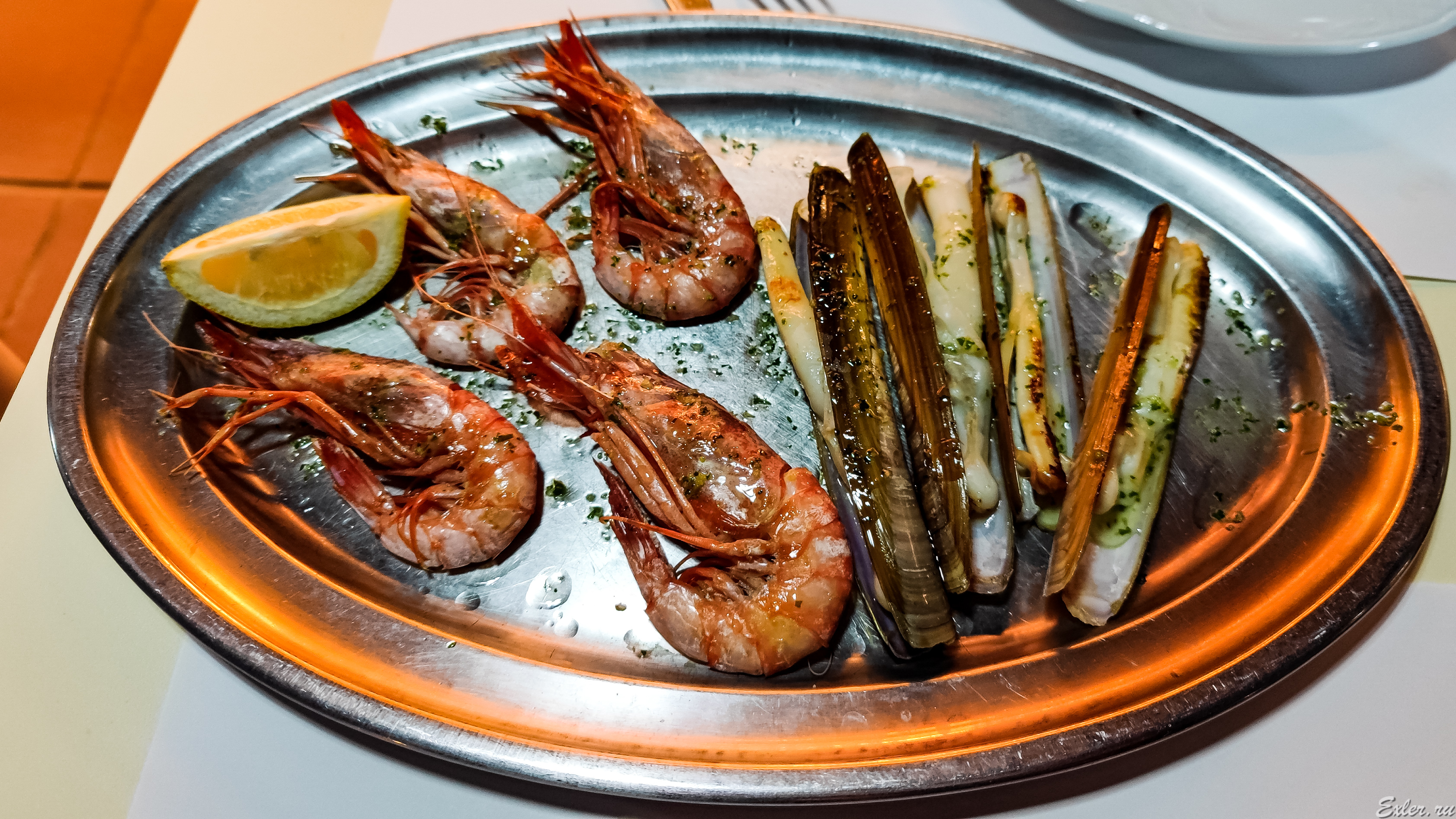 Там решили взять всего понемножку - попробовать. Тем более что в этом ресторане все блюда можно брать по полпорции. Взяли тарелку moralla - это тарелка с мелкой жареной рыбкой, - полную порцию мидий в их фирменном соусе (жена мидии очень любит, я раньше был не большой любитель, но теперь тоже зафанател), полпорции навахас (длинные морские моллюски) и стали думать, что бы взять еще.