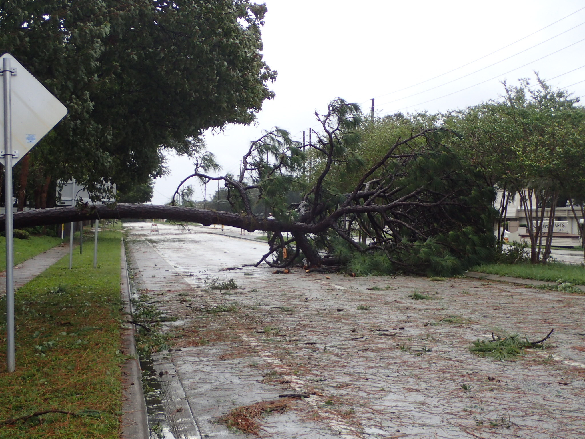 Бывает. Правда, град у нас очень редко. Вот, утро после урагана Ирма. Это довольно оживленная улица, 2 полосы в каждом направлении и разделитель. И так было во многих местах. Естественно, и провода все порвались. Там левее на столбах и электрические, и оптические. Света не было от 2 до 5 дней (в разных районах), кабельного 5 дней. При том, что чуваки начали ремонтные работы почти сразу.