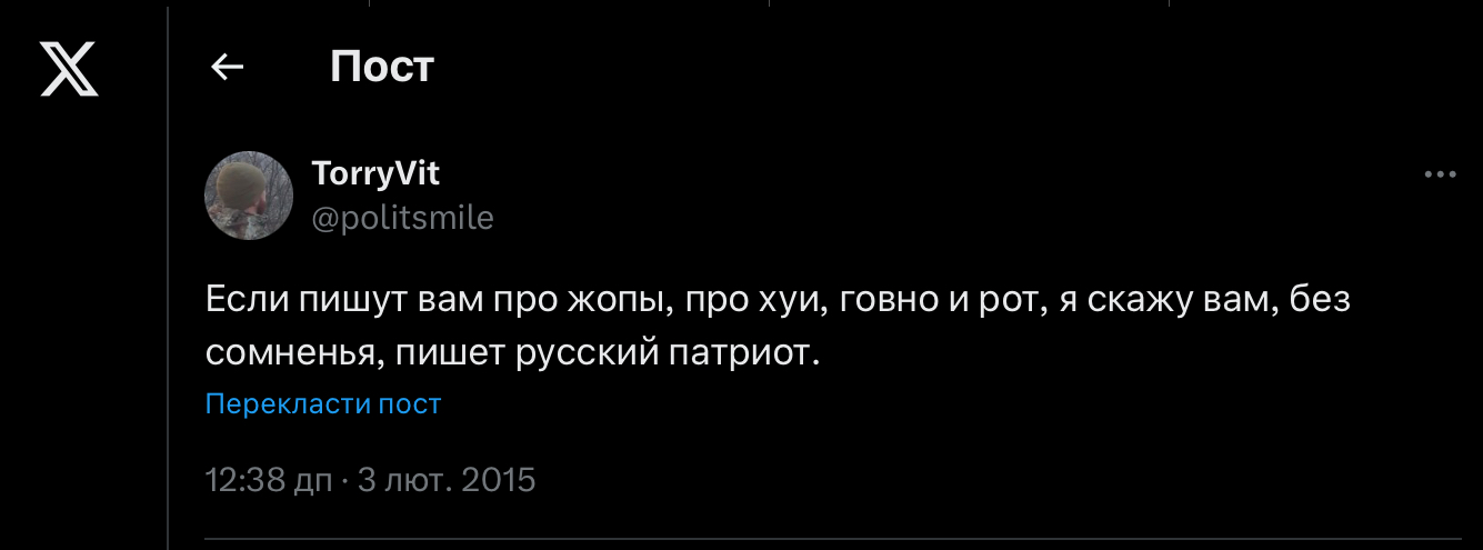 Это, конечно, прямо-таки монолог дня. Настоящий патриот, военный волонтер и все такое прочее докладывает Владимир Владимирычу обстановочку. Любопытно, что до самого патриота что-то начало доходить на четвертый год войны: что в народе эту сраную сывыо никто не поддерживает, что сывыошников никто за героев не считает, что военных волонтеров никто не поддерживает, что Вова окружил себя такими же старперами-миллиардерами, как он сам, и они только и думают, сколько бы еще миллиардов награбить.