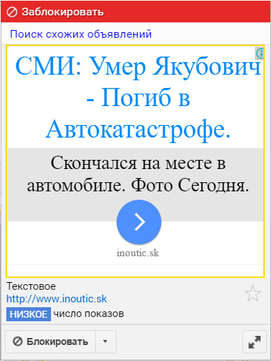 В последние пару недель проявляется совершенно дебильная реклама из серии "Якубович умер" или "Газманов разбился", которой какие-то уроды рекламируют всякие зарубежные сайты - видать владельцы этих сайтов настолько тупы, что покупают мусорный трафик у каких-то мутных русских. Формально правил такие объявления не нарушают, но лично я, например, не желаю видеть их на своем сайте. Что с этим делать?
