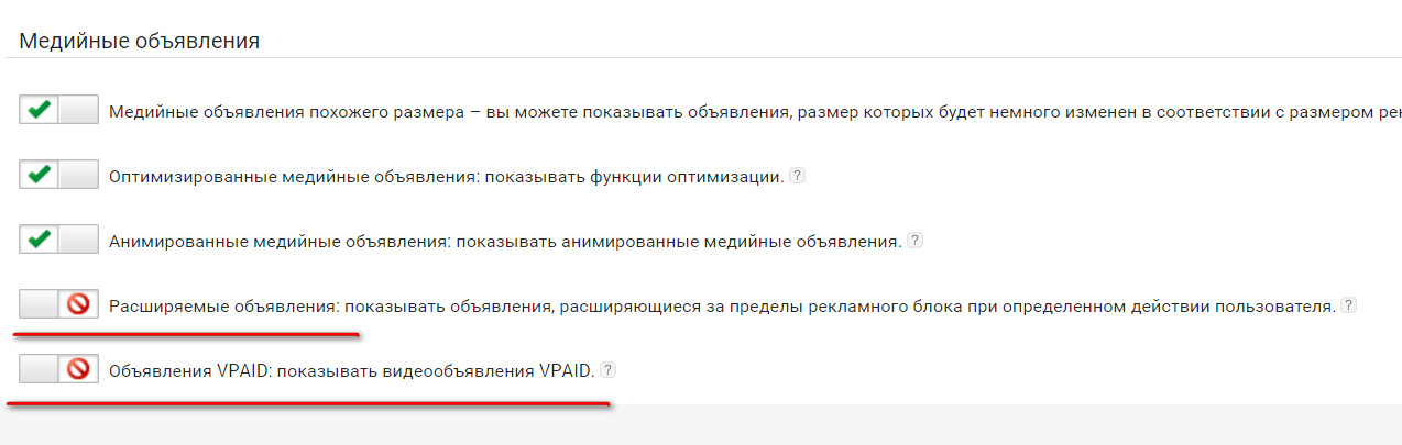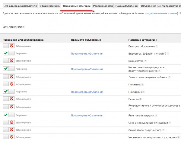 Там справа несколько закладок. Первым делом нужно зайти в закладку "Деликатные категории" и там выключить те категории рекламы, которые вы не хотите показывать на своих сайтах.