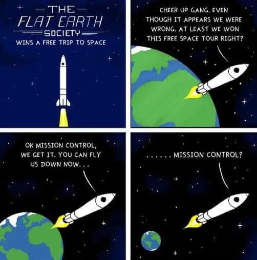 В школе он учится по «ложным» учебникам с круглой Землёй. Потом идёт в институт - там снова круглая Земля. Потом идёт строить спутники и ракеты — но их, по мнению плоскоземельцев, нельзя запустить в космос, так как там купол и всё это ложь. И, собственно, многие из работающих в этой области должны об этом знать и зачем-то (зачем?) участвовать в глобальном заговоре.