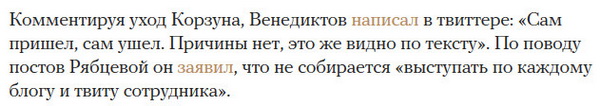 Upd: А с Венедиктовым, как оказалось, все уже совсем запущено. Какое заявление-то откровенно мерзкое. Ну, пускай остается со своей Рябцевой. Причины нет, выступать он не собирается. Что-то у меня последние остатки уважения к нему как-то совсем испаряются.