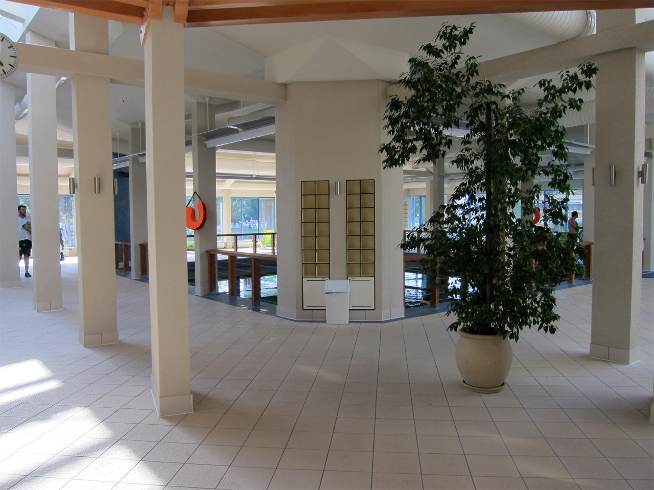 Одна девушка даже плавала в круге, читая книжку. Это она правильно придумала - лично для меня 20-30 минут не занимать ничем голову - большая проблема. Одно дело, если я в компании - так можно поболтать о том о сем. Другое - если я один. Вот тогда надо что-то придумывать для этих длительных водных процедур. Потому что заходов таких в озеро обычно делают три-четыре. Поболтался минут двадцать - идешь или загорать или просто отдыхать, для чего тут сделано несколько различных зон отдыха как снаружи, так и внутри. А потом опять - нырк в озеро.