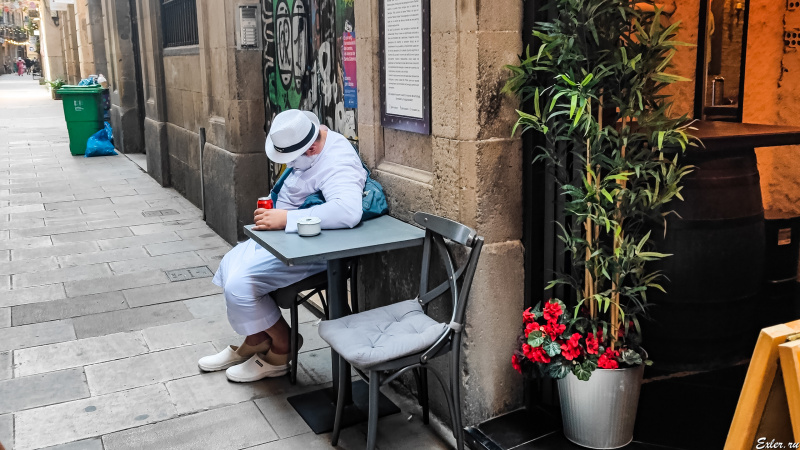 Были сегодня в Барселоне в грузинском ресторане Kinza, вышли - а там вот такой дяденька весь в белом-пребелом сидит, крепко спит после банки пива (неизвестно, какой по счету). Судя по тому, что он весь в белом и лицо тоже вымазано белой краской, дяденька работает "живой скульптурой" на Ла Рамбле, которая находится совсем неподалеку.