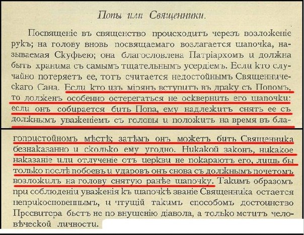 Жалуют священством, возлагая руки на голову возводимого в это звание и надевая ему на голову, освященную патриархом, шапочку, называемую скуфьей. Священник должен ее весьма заботливо беречь, потому что он считался бы в противном случае не достойным священного звания. Мирянин в драке со священником обязан более всего заботиться о том, чтобы не замарать его шапочки, кто хочет бить попа, тот обязан с должным почтением снять с его головы шапочку, положить в приличном месте, а потом может уже безнаказанно и сколько ему угодно колотить попа.