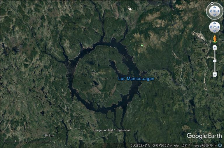 Кратер Маникуаган. Недавние исследования показали, что расплавленные в результате столкновения породы имеют возраст 214 ± 1 млн лет.