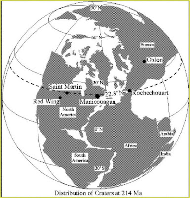 Но у этих кратеров порой важен не химанализ, а их расположение и роль в истории планеты. Занятная байка: вот есть в Украине кратер Оболонь. Не чета этой эстонской дырке, там до 20 км в диаметре, взрывного типа. Есть в Канаде кратер Маникуаган, у которого диаметр 100 км. Ну есть и есть, общего между ними было примерно одинаковое время образования, 215 млн лет назад с точностью плюс-минус сто тысяч лет, насколько это можно определить. Еще такие кратеры были во Франции (Rochechouart), в Америке (Red Wing) и в Канаде еще Сен-Мартин в провинции Манитоба. Но так как они были где попало, их никто между собой не связывал. Но в середине девяностых геофизик Дэвид Роули вдруг подумал, а как же эти кратеры лягут на карту континентов конца триасового - начала юрского периода. Нарисовал и присвистнул - получилась идеальная цепочка с "кроличьей лапкой", как должны разваливаться кометы, влетая по касательной в атмосферу. И сейчас самой правдоподобной считается версия, что все это - следы одного тела и одной глобальной катастрофы.
