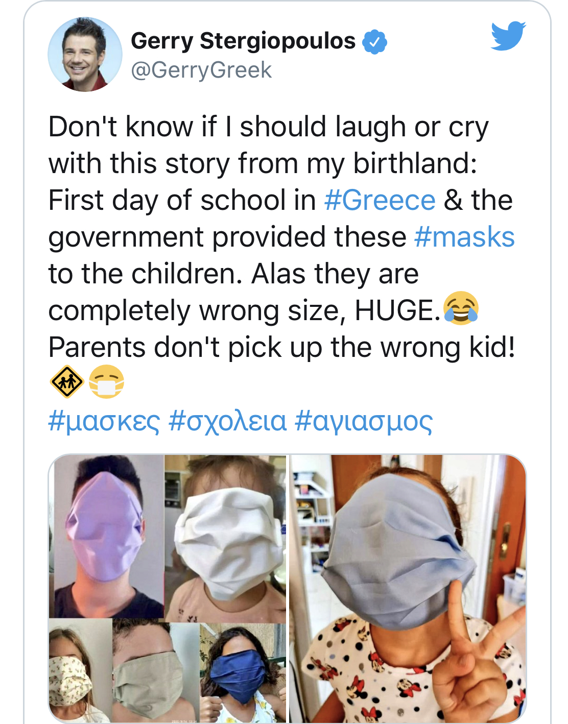 Ну и маски, разумеется, куда ж без них. Как раз из Греции новаторство для учеников подоспело. Удобно, кстати: можно просто любого ребёнка в школу сдавать и забирать - всё равно никто ничего не заметит, а на следующий день они опять в школе встретятся.