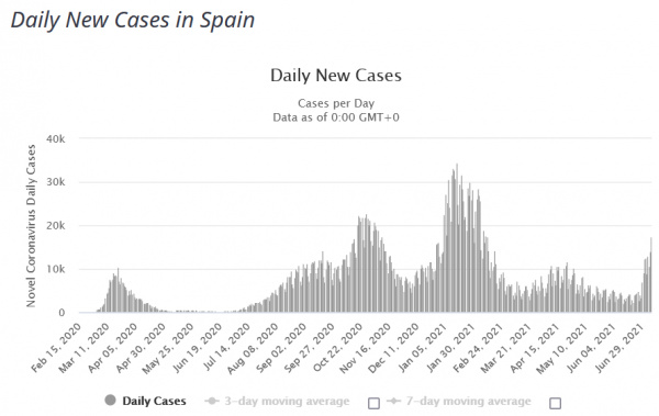 В Испании идет довольно резкий рост количества выявленных носителей (за несколько недель средняя выявляемость в Испании увеличилась на 137%, достигнув 252 случаев на 100 000 жителей.), и уже говорят о "пятой волне", причем всякие группы экспертов, как обычно, строят пугающие графики и бомбардируют правительство предложениями снова ввести комендантский час и снова заставить всех сидеть дома и не рыпаться, однако в правительстве - по крайней мере, пока - ведут себя вполне разумно - "Sanidad descarta el toque de queda a pesar del incremento de los contagios entre los jóvenes".