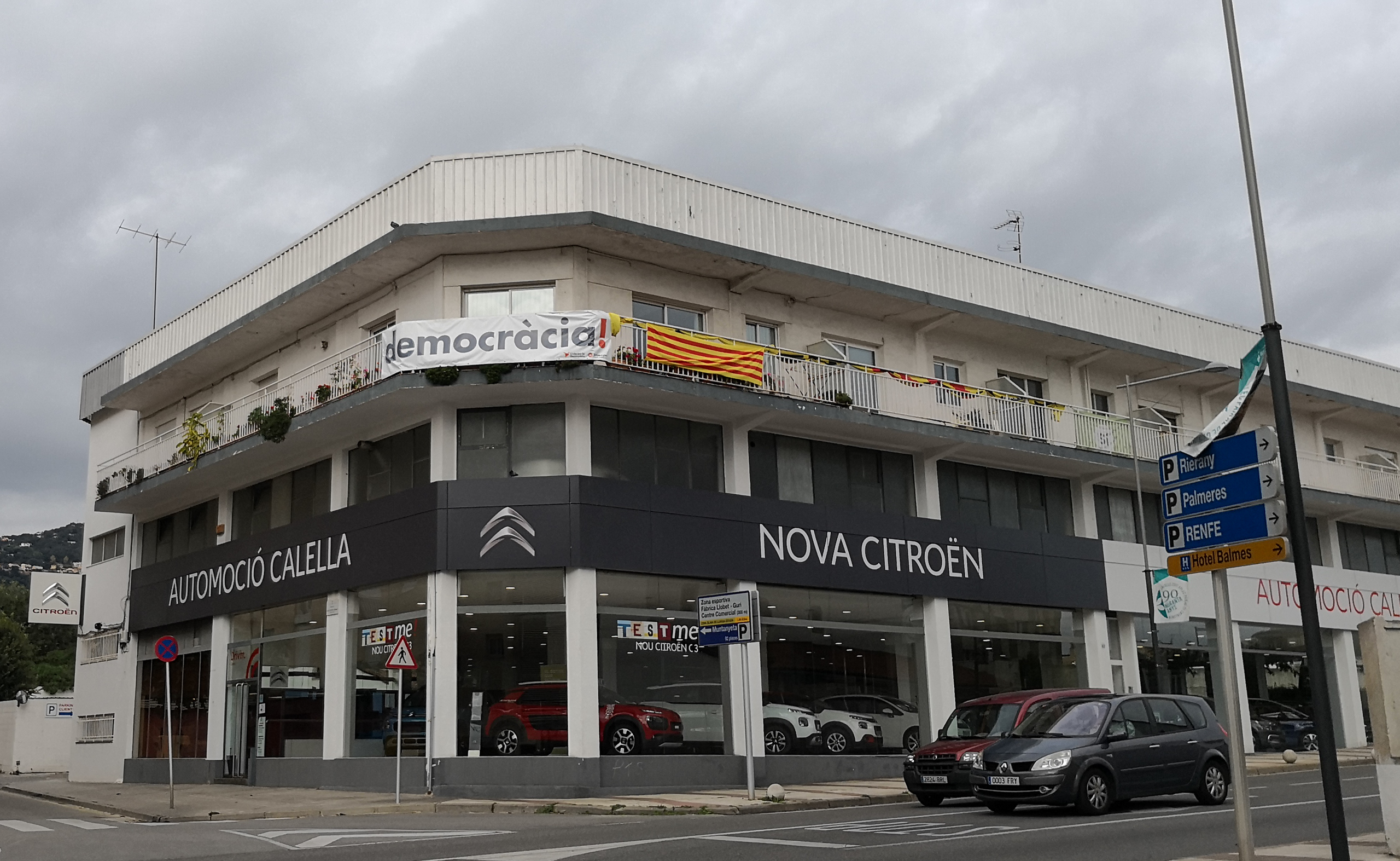 Салон и автосервис "Ситроен", над которым висят здоровенные сепаратистские плакаты, открыт. Я туда заглянул, менеджер сказал, чтобы я побыстрее посмотрел то, что мне нужно - мол, они скоро на обед закрываются.
