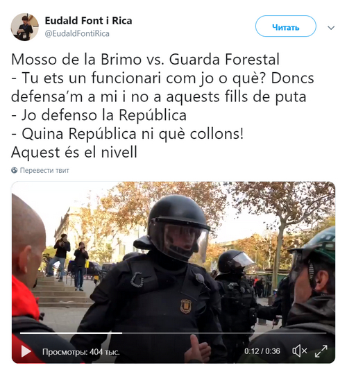 Журналисты засняли любопытный диалог между полицейским и сотрудником лесной службы Каталонии (он был в форме), участвующим в протесте от имени этого их "Комитета защиты республики".
