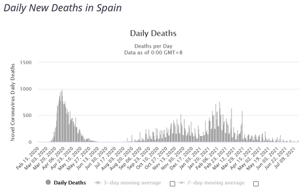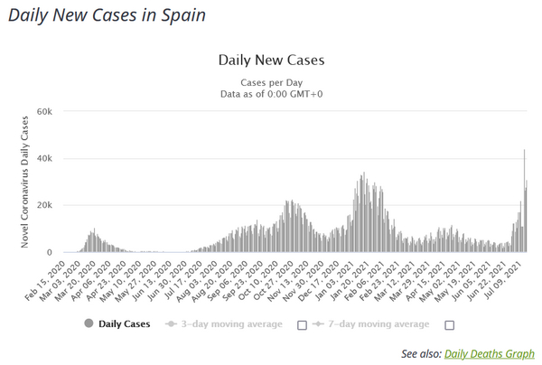 Ковидоистерики считают, что этот резкий взлет обусловлен вовсе не распространяющимся индийским штаммом (а, судя по всему, именно ему мы и обязаны), а тем, что правительство разрешило не носить намордники на улице, если можешь соблюдать безопасное расстояние. И это особенно смешно, потому что на самом деле намордники на улице испанцы так и продолжают носить, а не носят их только те, кто и раньше не носили.