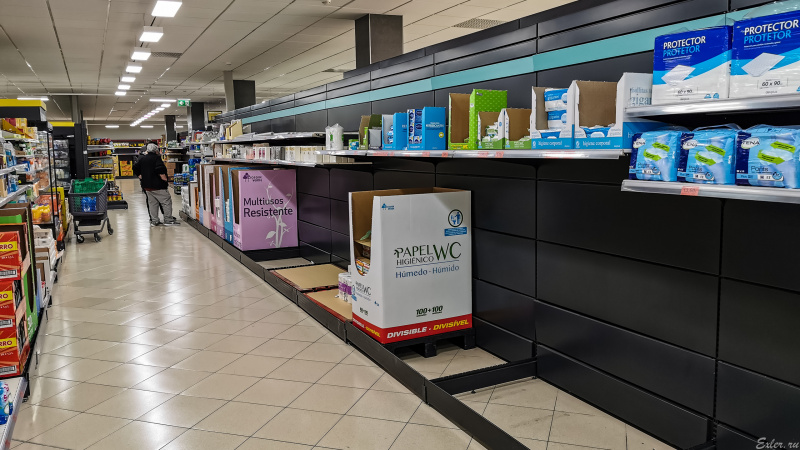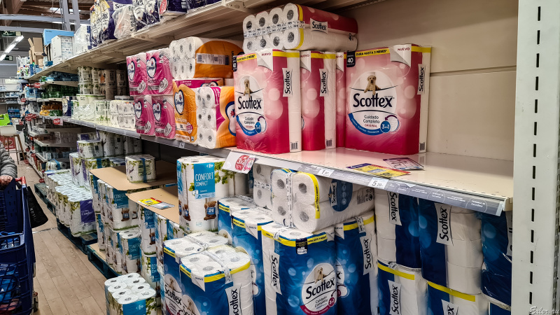 В большом "Каррефуре" отгородили специальную секцию, в которой стоят те товары, которые больше всего разбирают: туалетная бумага, бумажные полотенца, вода в больших упаковках, памперсы. И тут это все было представлено, никто не разбирал.
