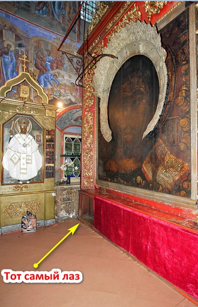 Тутаевский Спас. Тот самый лаз. Существует традиция с молитвой проползать под чудотворной иконой Спасителя на коленях. Для этого в киоте под иконой устроено специальное окошко. В доске под святым образом, по которой ежедневно проползают многие люди, за два столетия коленями вытерли две колеи.