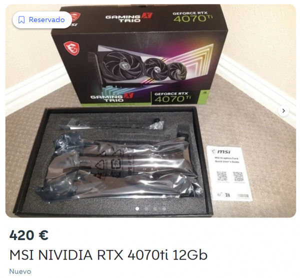 Глянул испанскую барахолку - там попался даже вот такой вариант мощнейшей 4070 TI, причем утверждалось, что карта новая, но вообще 4070 TI стоит порядка €1200, так что я решил ерундой не заниматься (подсунут еще майнинговую) и купил новую на PCComponentes.