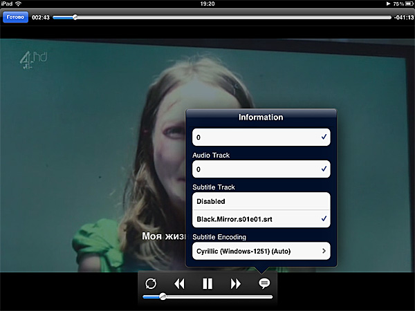 Ну и в процессе воспроизведения доступен полный сервис - можно выбирать аудиодорожки, дорожки субтитров, задавать кодировку.