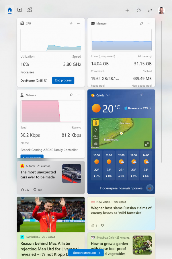 Также в обновление были добавлены новые экспериментальные виджеты производительности ПК, и это вообще очень удобно. Впрочем, просто так эти виджеты недоступны, но они появятся, если скачать и установить с сайта Microsoft Dev Home App (Preview).