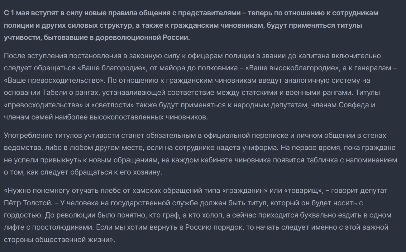 "Ваше благородие: Госдума вернёт титулы учтивости по отношению к сотрудникам полиции и чиновникам"