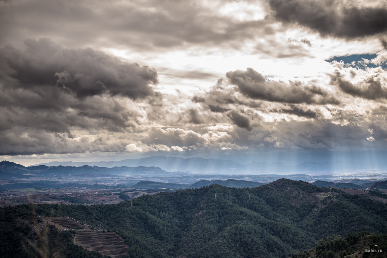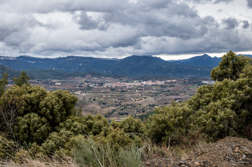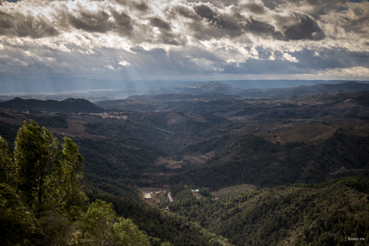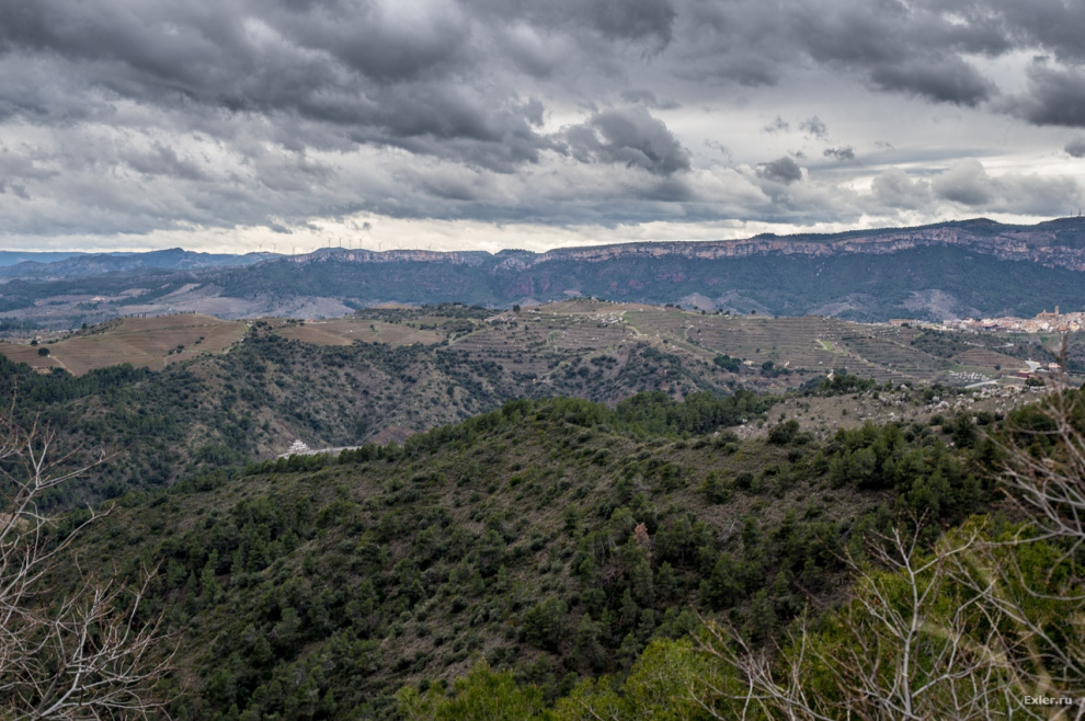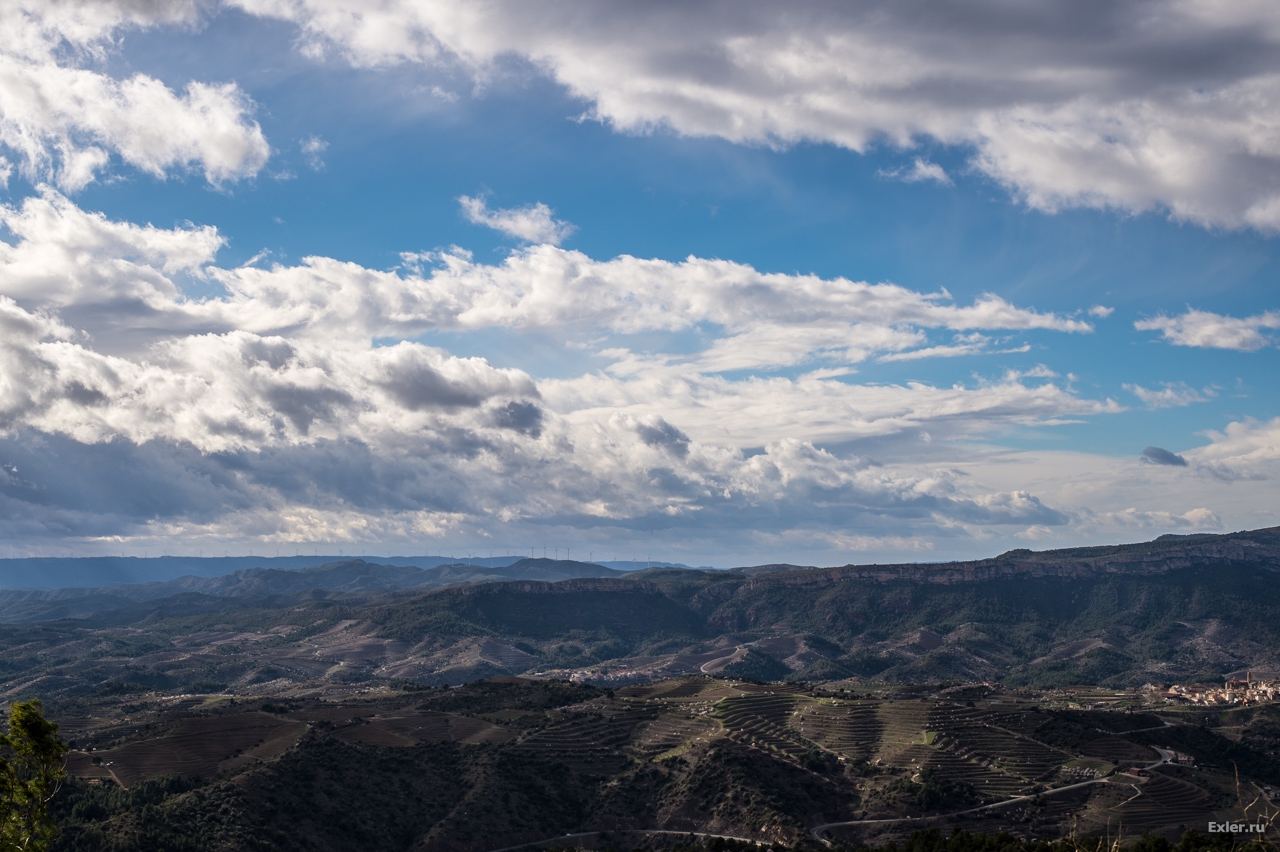 Наконец добрались до самого верха холма, откуда открывался чудесный вид на долину. Причем там было очень ветрено и пасмурно, и облака хорошо подчеркивали суровость условий, в которых приходится работать виноделам Приората.