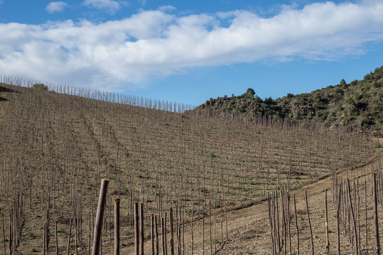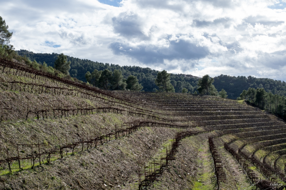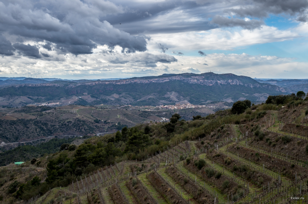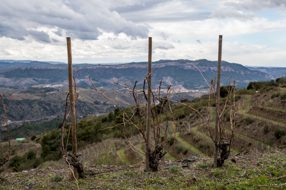 Террасы для винограда на холмах формируются строго продуманным образом. Во-первых, в Приорате отказались от двухрядных террас, характерных для некоторых других горных районов. Здесь только один ряд лозы на ступени - это позволяет избежать различий в качестве между двумя рядами на ступени. Во-вторых, высота ступени - не более 1,5 метров, причем это делается для того, чтобы не вносить заметных искажений в пейзаж холмов: при такой высоте террасы не сильно выделяются. В-третьих, ширина ступени - всего один метр. Во многих хозяйствах даже для одного ряда лозы оставляют 2 метра - чтобы могла пройти техника для обработки виноградников. В Mas Martinet используют тракторы шириной в метр, поэтому можно делать максимально узкие ступени.
