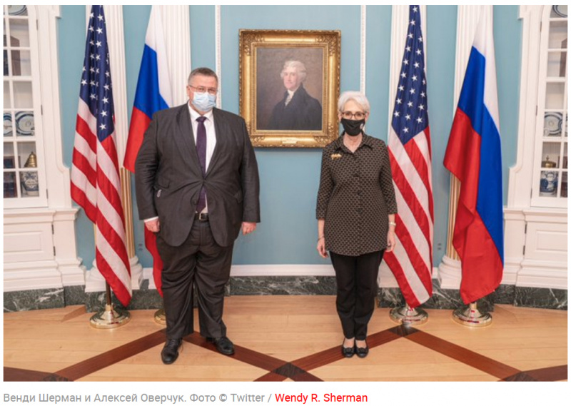 "У нас с вице-премьером России Алексеем Оверчуком состоялась продуктивная встреча... США продолжат работать над стабильными и предсказуемыми отношениями с РФ, призывая при этом [Россию] к более активным действиям по борьбе с изменением климата и обеспечению европейской энергетической безопасности", — написала Шерман. (Отсюда.)