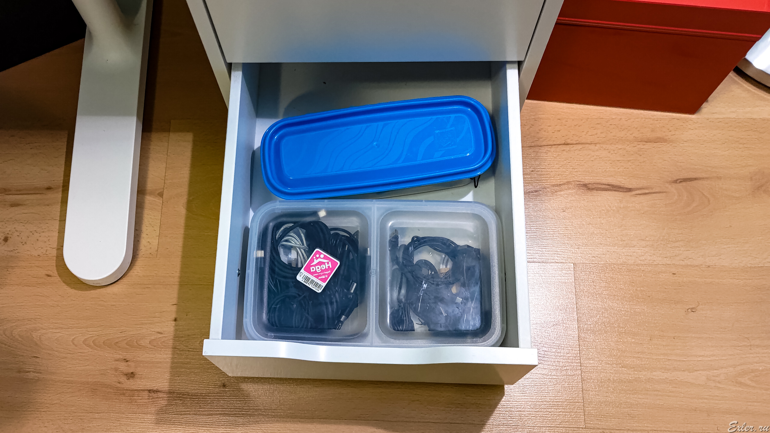 Зуд утолил, навел порядок и там: зацените, как теперь все чинно и благородно! Слева в прозрачном ящике кабели Type-C, справа - microUSB, под синей крышкой - универсальные кабели и переходники. Совсем другое дело!