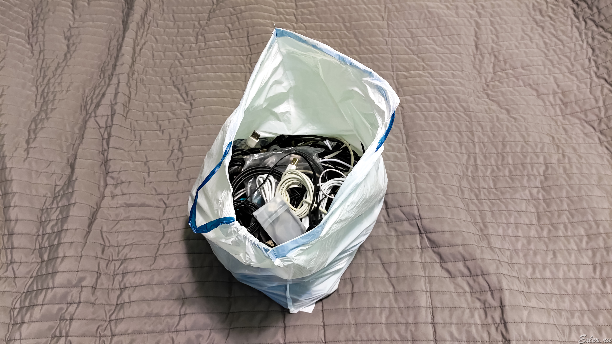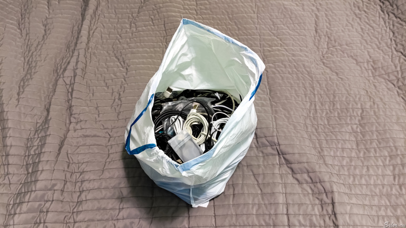 И вот такой пакет кабелей собрал на выход - это все совершенно лишнее, ненужное (зачем мне по 50 кабелей Type-C и тем более microUSB?). Отнесу к мусорным ящикам, оставлю там: кому нужно - заберут. Практика показывает, что оставленные там вещи (вообще говоря, любые) без хозяина остаются минут пять, не больше - при всей кажущейся безлюдности этого места.