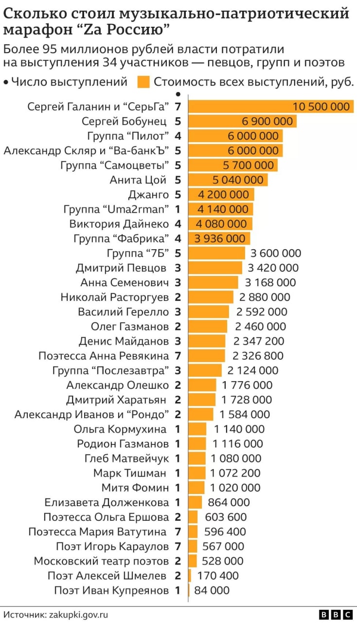 Патриотический марафон в поддержку так называемой спецоперации обошелся в рекордную сумму - 95,3 млн. рублей. Певцы ротом на поддержке войны отлично заработали, в то время как путинские орки убивали мирных жителей Украины.
