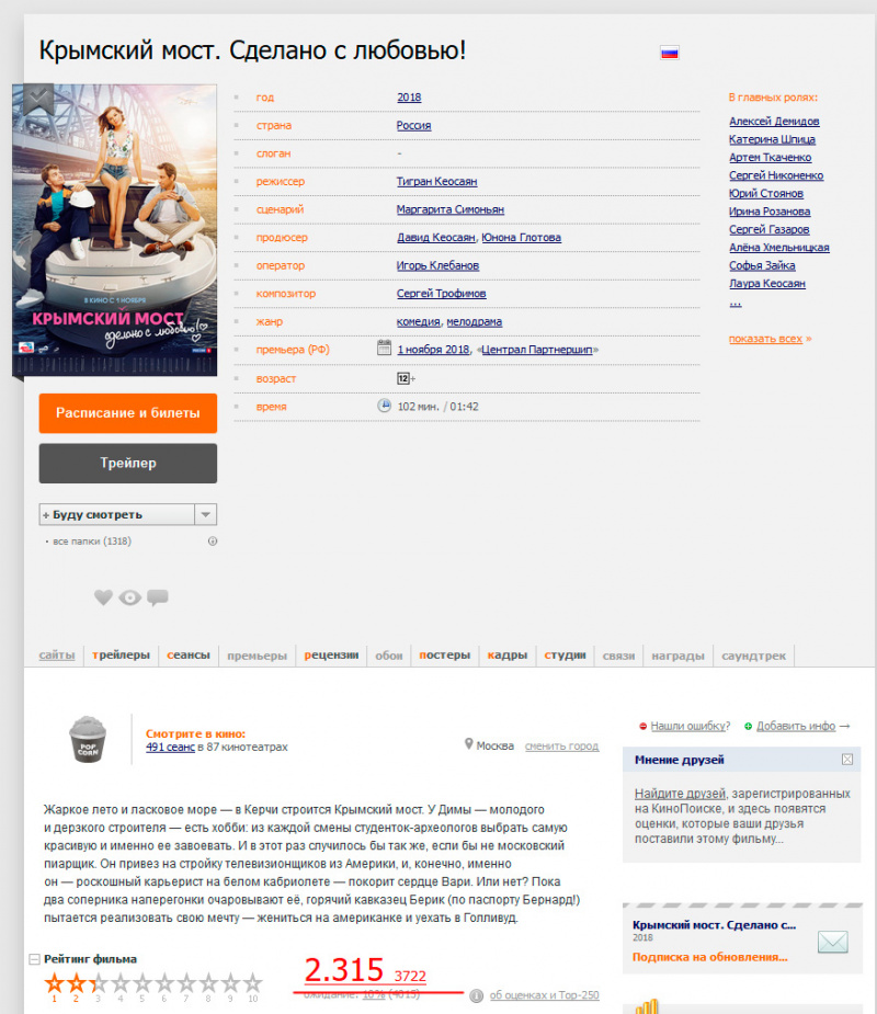 Ах если бы. Один только "фонд кино" пилит 2,5-3 миллиарда рублей на "кино", и это безусловно категорически неприемлимо, но отрицательный рейтинг накручивают почему-то только "Крымскому мосту", причем именно что по идеологическим соображениям. Попили Кеосаян что-нибудь на тему ВОВ и абсолютно никто бы на это не возбудился.
