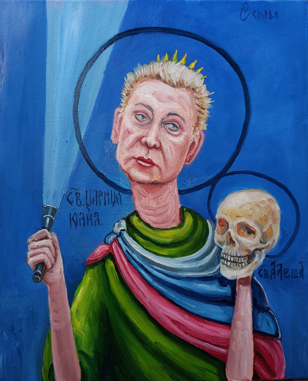 Иконопись, масло, холст. 50/60 см. Ипонопискец Семён Скрепецкий. В 2021 году Юлия Навальная отвезла своего мужа Алексея в российскую тюрьму и передала из рук в руки русским опричникам. В 2024 году, после смерти Алексея великомученика, Юлия унаследовала корону русской оппозиции, став императрицей ПРБ. Юлия унаследовала от мужа прибыльную мануфактуру "ФБК", вместе с крепостными работниками, Лёньку Волкова и несколько тысяч верных но бесполезных холопов. Юлия продолжила яростное сопротивление путинскому режиму и беспощадно светила фонариком, тем самым доставляя путину мучительные страдания.