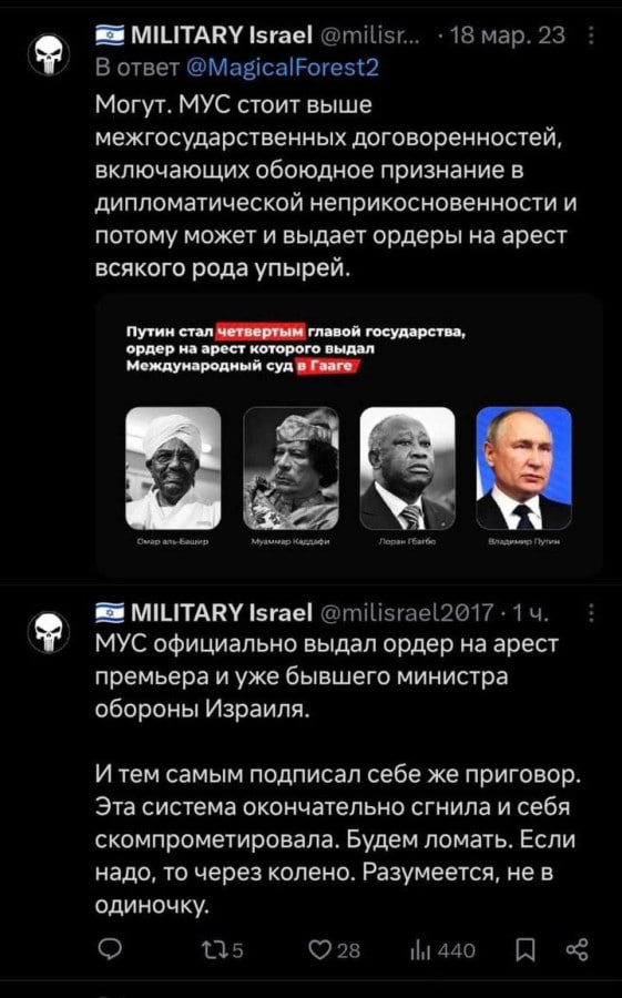 Ну что ж, совершенно адекватный, правильный и корректный ответ. Если МУС теперь настолько неадекватен, то с какого бодуна какие-то страны должны выполнять его решения? Я писал о том, что нынешний фортель МУС полностью обесценивает ордер на арест Путина, но если у этого Карима Хана снесло крышу, то что теперь с этим делать? Только выдавать ордер на арест Карима Хана - чуваку нужно срочно проверить голову. И секретные счета, на которых может обнаружиться немало интересного.