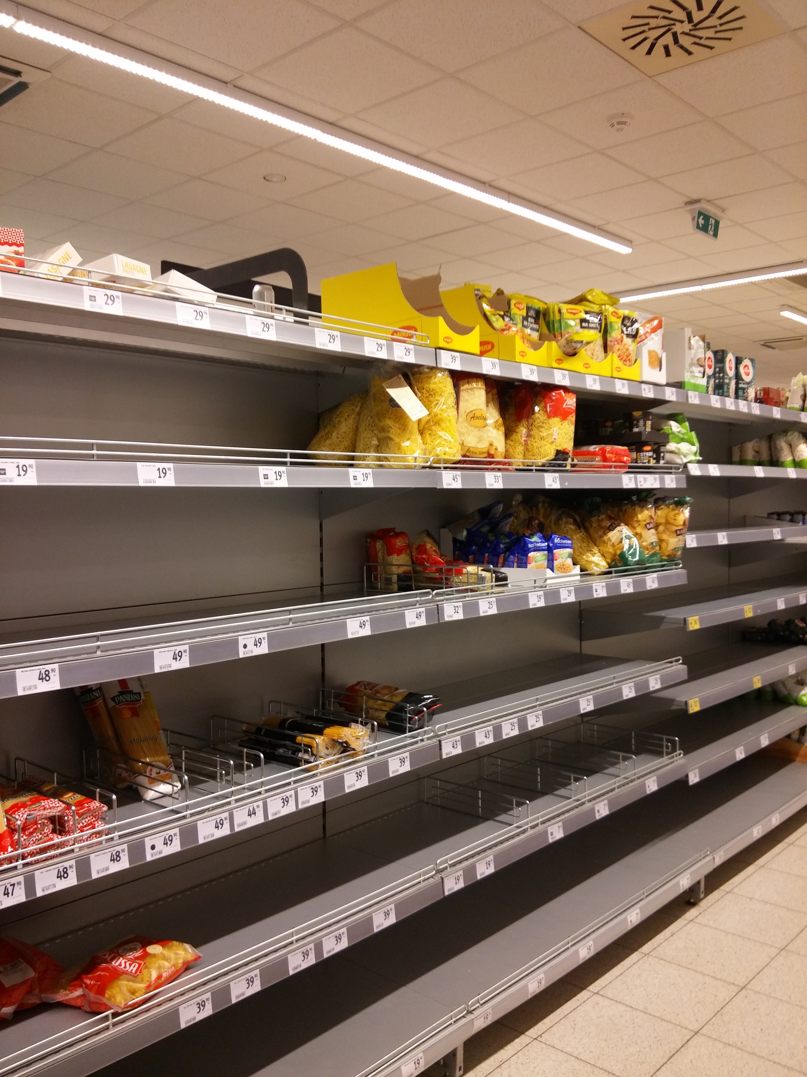 Вот так полки с макаронами в супермаркете Albert у нас в Брно сегодня вечером выглядят. Сахар тоже разгромили. Впрочем, я был сегодня в других супермаркетах где такого не наблюдалось и полки были полностью заполненными.Я читал сегодня в новостях про один интернет-магазин с продуктами у которого заказ по весу доходил до 500 кг. Но некоторые сети успокаивают и говорят, что учли опыт Италии и заказали нужных продуктов с запасом, и что они не будут вводить ограничения на продажу. В общем, ситуация пока непонятная, но оптимизма у меня нет. Границы открыты и дело времени когда появятся первые заболевшие.