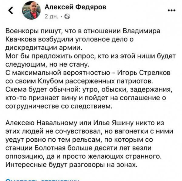 Ну что ж, вот и за Гиркиным пришли. Ожидаемо. Совсем он в последнее время распоясался, возносил хулу на страшно сказать кого! Но посмотрим, как оно дальше будет. Могут попугать и отпустить. Могут попугать и не отпустить. Могут и не пугать, а сразу того-этого.