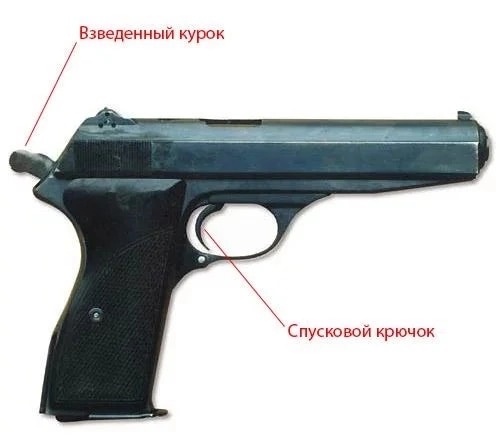 На курок не нажимают. Курок — это такой рычажок сзади пистолета/револьвера. Его взводят.