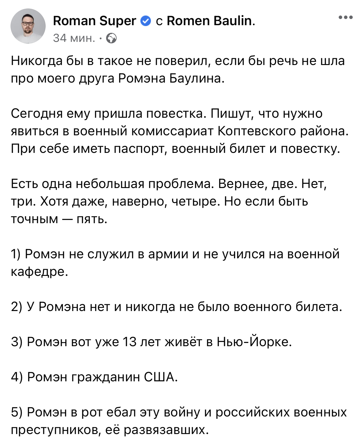 «Это должны раздавать официально из военкомата тем людям, которые служили и имеют военно-учётную специальность. Но Москва, хотя ей и выдали мизерный план, выполнила на 50%. Вот такая она у нас гнилая оказалась. Но так не должно быть, это как будто специально делают, чтобы панику посеять. Из Москвы и так много людей уехало. Москва в этом плане не в лучшую сторону отличается. Но у метро раздавать повестки никто не должен. Как они определят, что это за человек? Это же смешно. Это какая-то провокация 100%», – член комитета ГД по обороне Виктор Соболев изданию «Подъём»