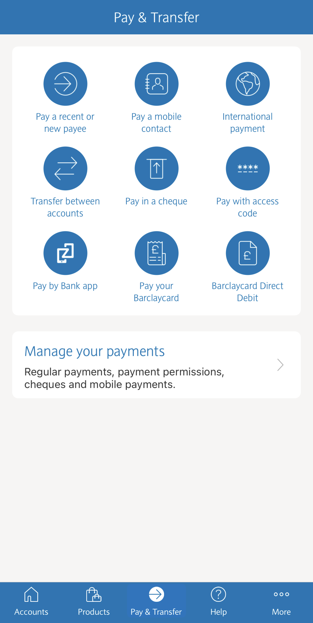 Странно, у меня в мобильном приложении Barclays есть раздел "Pay & Transfer" (в середине нижнего ряда иконок на главном экране приложения), там в левом верхнем углу иконка "Pay a recent or new payee", все получатели платежей видны, всё наглядно и просто. Какой смысл в копировании платежей из истории транзакций? Вы давно обновляли приложение вообще? Такое впечатление, что у вас оно какое-то обрезанное (в плане функциональности).