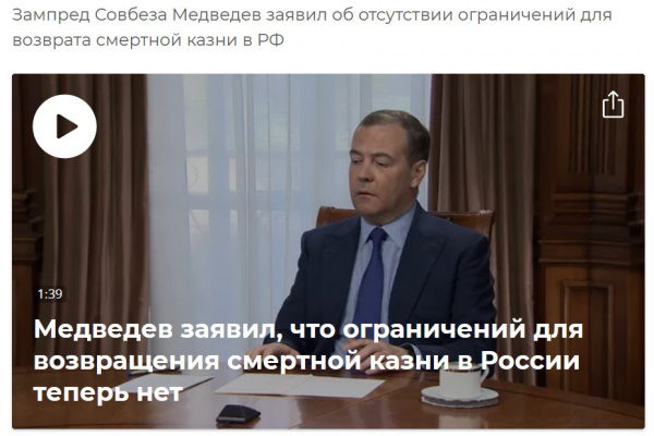 МОСКВА, 25 мар — РИА Новости. Ограничений для возвращения смертной казни в России теперь нет, но все будет зависеть от текущей ситуации — мораторий может остаться, если все будет спокойно, или же его пересмотрят в случае необходимости, заявил зампредседателя Совбеза Дмитрий Медведев в интервью РИА Новости. (Отсюда.)